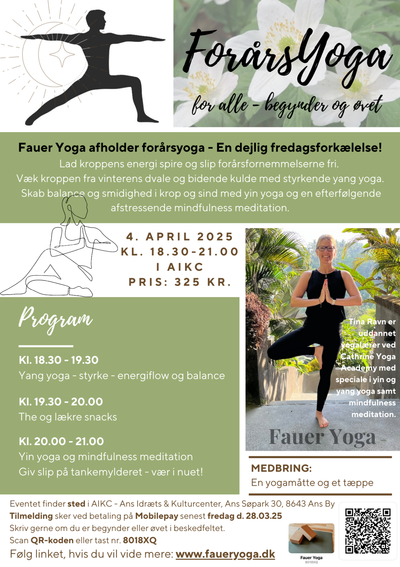 Jeg hedder Tina Ravn og er certificeret yogalærer. Mit speciale er yin og yang yoga samt mindfulness meditation. Min yogauddannelse tog jeg på Bali ved Cathrine Yoga Academy og jeg ejer firmaet Fauer Yoga. Yoga for mig er tid til fokus på både krop og sind. Med yin yang yogaen skabes der balance mellem det dynamiske og det rolige, mellem styrke og smidighed samt væren og gøren.